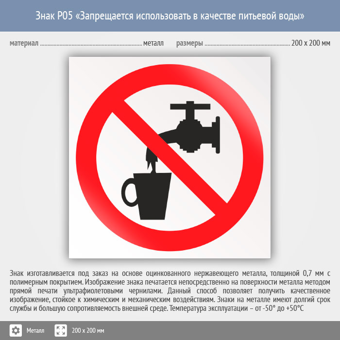 Знак P05 «Запрещается использовать в качестве питьевой воды» (металл, 200х200 мм) в Магнитогорске купить