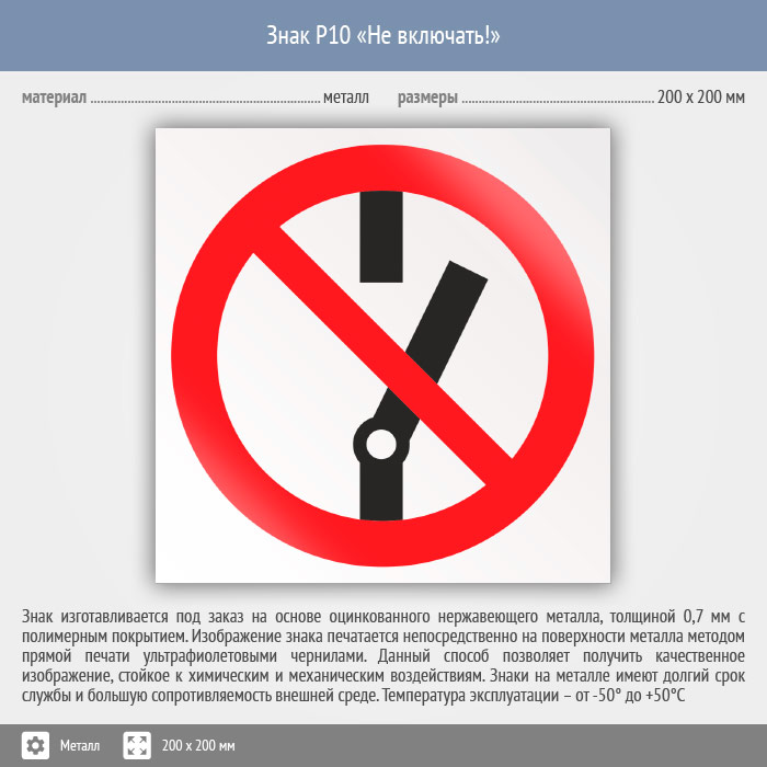 Знак P10 «Не включать!» (металл, 200х200 мм) в Магнитогорске купить