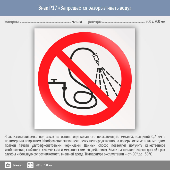 Знак P17 «Запрещается разбрызгивать воду» (металл, 200х200 мм) в Магнитогорске купить