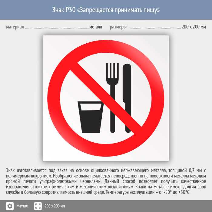 Знак P30 «Запрещается принимать пищу» (металл, 200х200 мм) в Магнитогорске купить