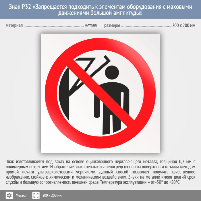 Знак P32 «Запрещается подходить к элементам оборудования с маховыми движениями большой амплитуды» (металл, 200х200 мм) в Магнитогорске купить