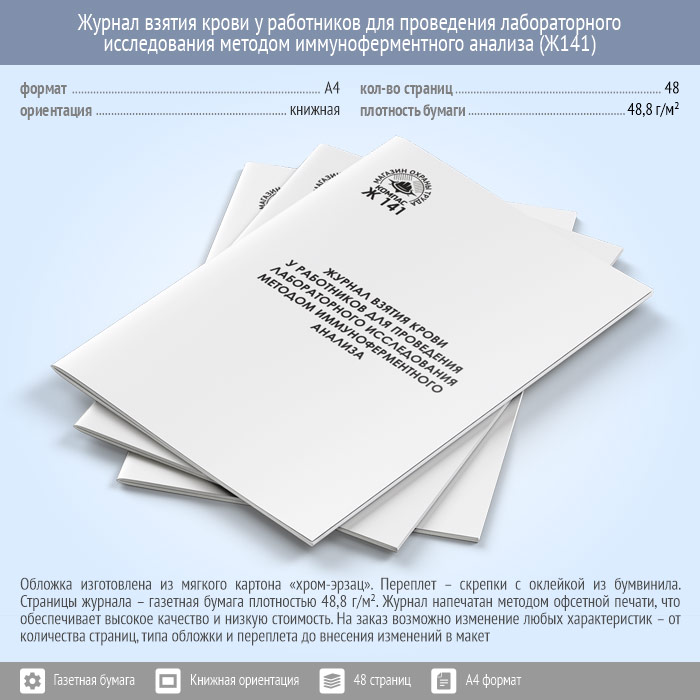 Журнал взятия крови у работников для проведения лабораторного исследования методом иммуноферментного анализа (48 стр., Ж141) в Магнитогорске купить