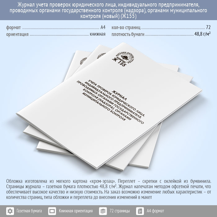Журнал учета проверок юридического лица, индивидуального предпринимателя, проводимых органами государственного контроля (надзора), органами муниципального контроля (новый) (72 стр., Ж155) в Магнитогорске купить