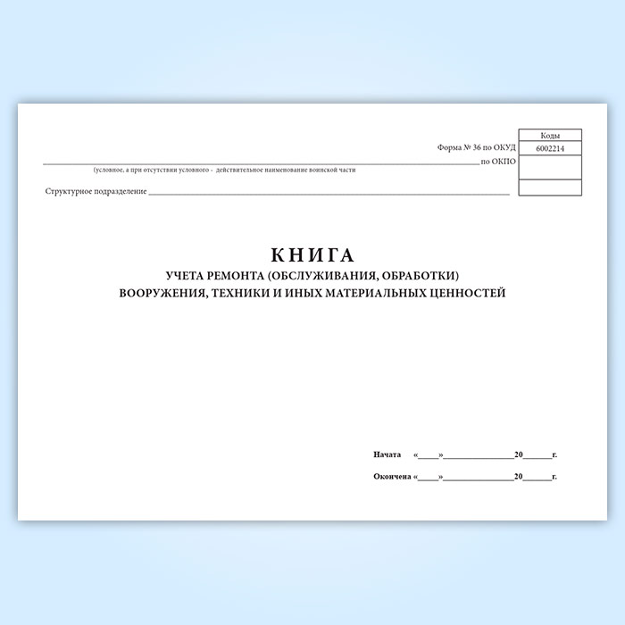 Книга учета ремонта (обслуживания, обработки) вооружения, техники и иных материальных ценностей (форма 36) в Магнитогорске купить