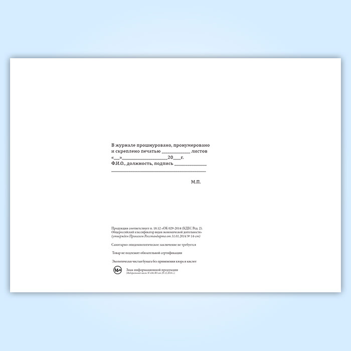Вы получаете печатную продукцию прошнурованной и c местом для вашей печати в соответствии с действующими нормативными документами: