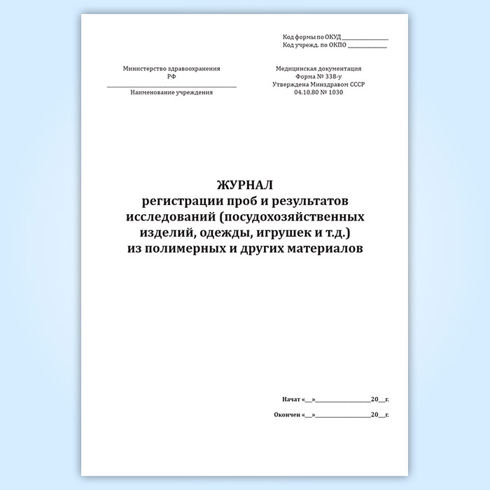 Журнал регистрации проб и результатов исследований (посудохозяйственных изделий, одежды, игрушек и т.д.) из полимерных и других материалов (форма № 338-у) в Магнитогорске купить