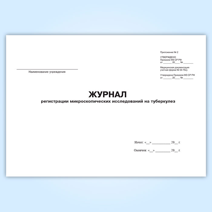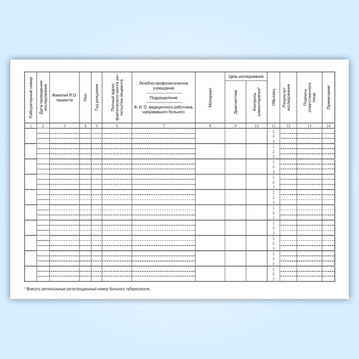 Журнал регистрации диагностического материала, собранного для микроскопических исследований на туберкулез (форма № 04-1-ТБ/у) в Магнитогорске купить