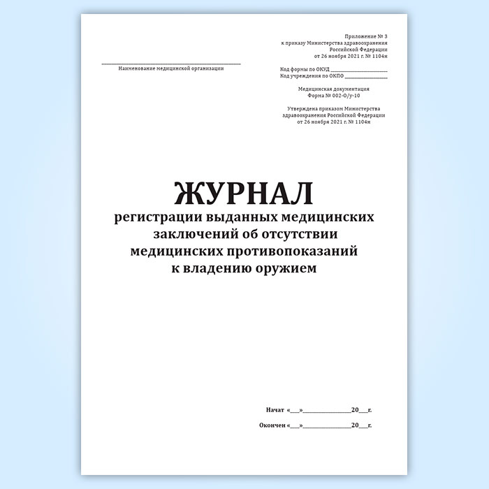 Журнал регистрации выданных медицинских заключений об отсутствии медицинских противопоказаний к владению оружием (форма 002-О/У-10) в Магнитогорске купить