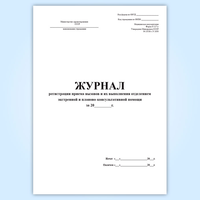 Журнал регистрации приема вызовов и их выполнения отделением экстренной и планово-консультативной помощи (форма 117/у) в Магнитогорске купить