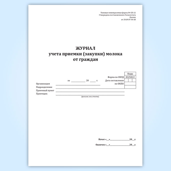 Журнал учета приемки (закупки) молока от граждан (форма СП-22) в Магнитогорске купить