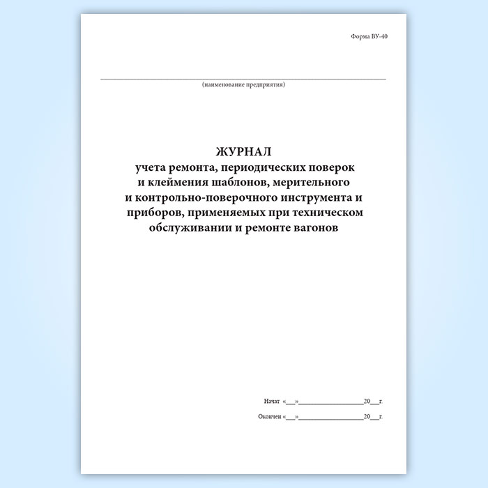 Журнал учета ремонта, периодических поверок и клеймения шаблонов, мерительного и контрольно-поверочного инструмента и приборов, применяемых при техническом обслуживании и ремонте вагонов (форма ВУ-40) в Магнитогорске купить