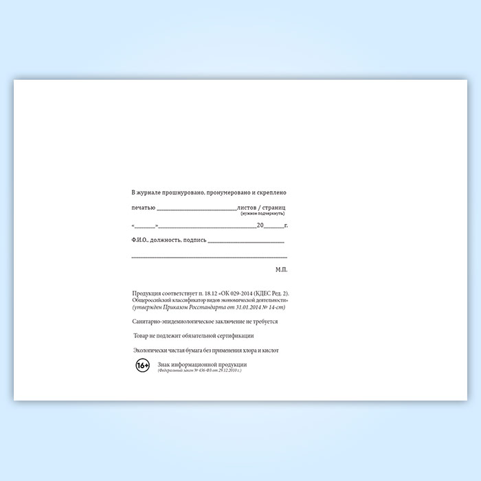 Вы получаете печатную продукцию прошнурованной и c местом для вашей печати в соответствии с действующими нормативными документами: