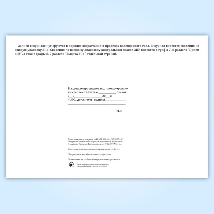 Вы получаете печатную продукцию прошнурованной и c местом для вашей печати в соответствии с действующими нормативными документами: