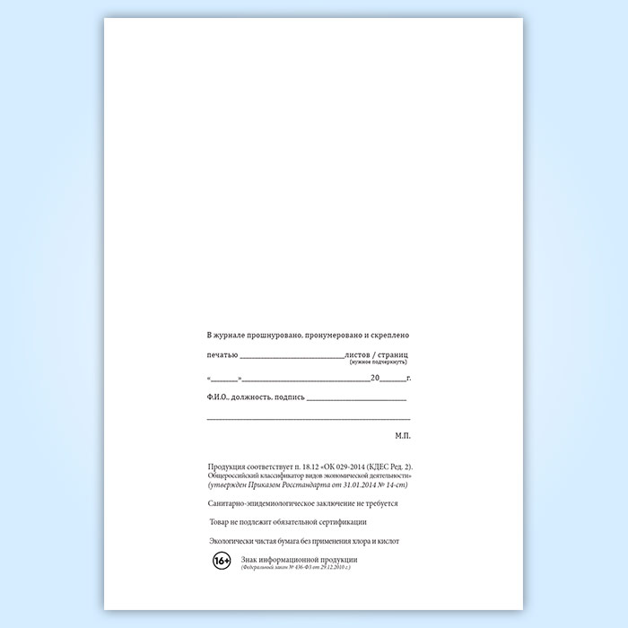 Вы получаете печатную продукцию прошнурованной и c местом для вашей печати в соответствии с действующими нормативными документами:
