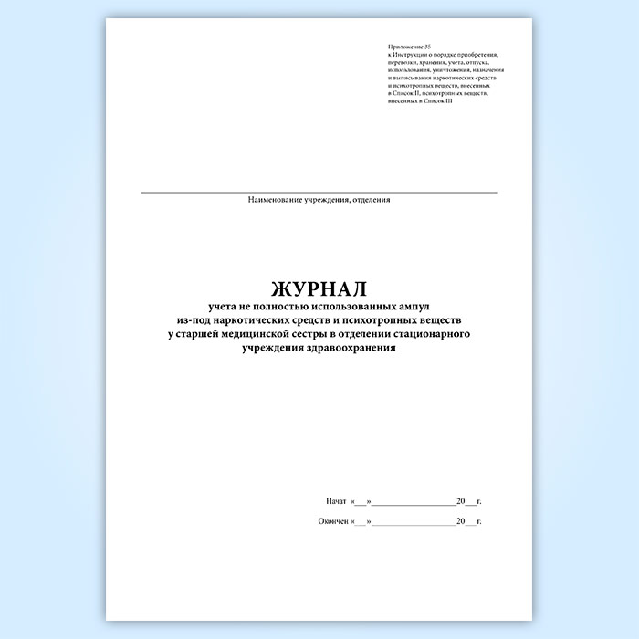 Журнал учета не полностью использованных ампул из-под наркотических средств и психотропных веществ у старшей медицинской сестры в отделении стационарного учреждения здравоохранения в Магнитогорске купить