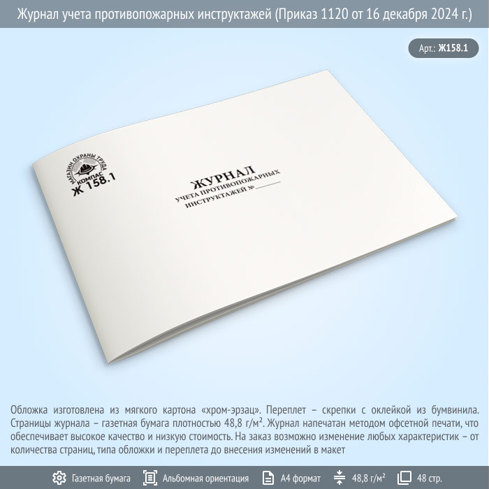Журнал учета противопожарных инструктажей (Приказ 1120 от 16 декабря 2024 г.) (48 стр., Ж158.1) в Магнитогорске купить