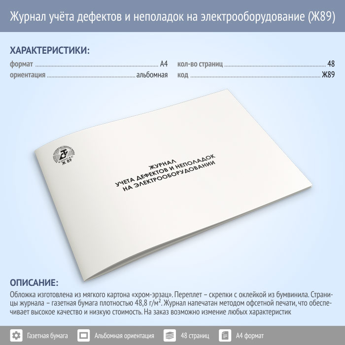 Журнал учета дефектов и неполадок электрооборудования (48 стр., Ж89) в Магнитогорске купить
