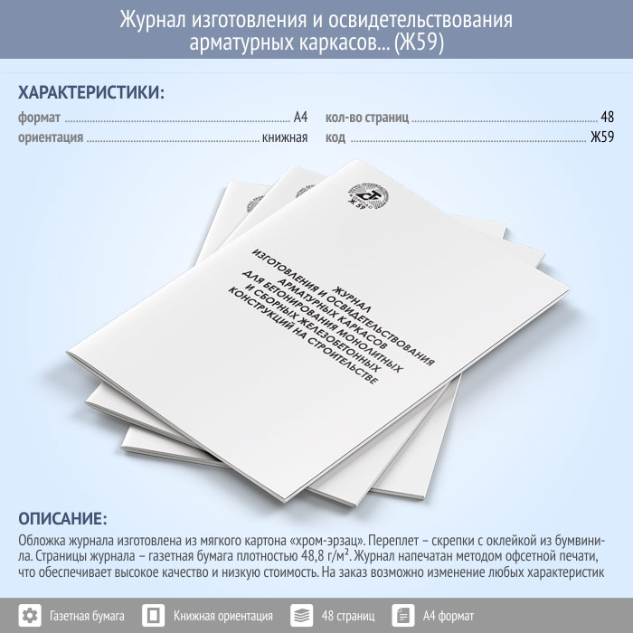 Журнал изготовления и освидетельствования арматурных каркасов для бетонирования монолитных и сборных железобетонных конструкций на строительстве (Ф-48) (48 стр., Ж59) в Магнитогорске купить
