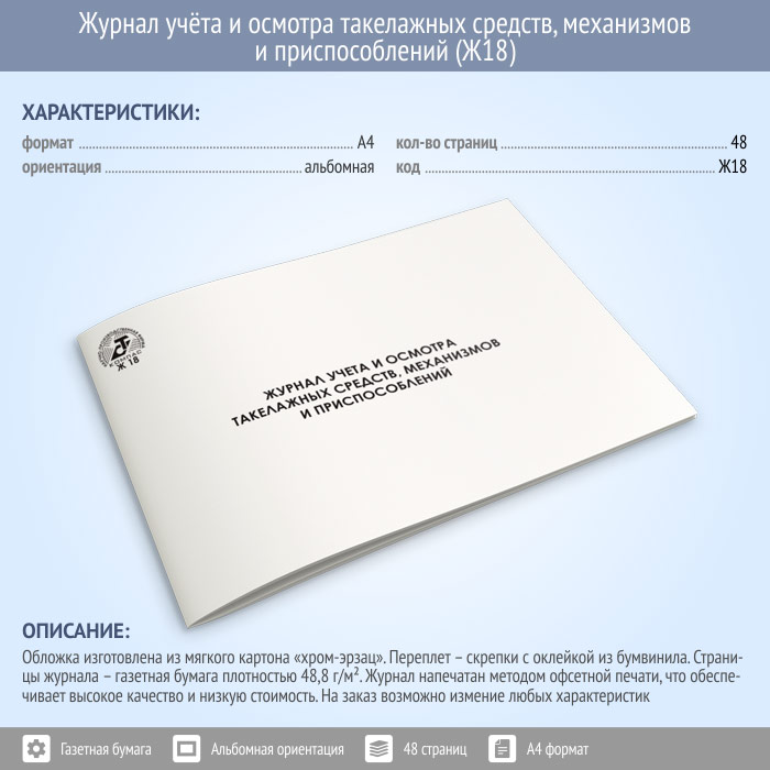 Журнал учета и осмотра такелажных средств, механизмов и приспособлений (48 стр., Ж18) в Магнитогорске купить