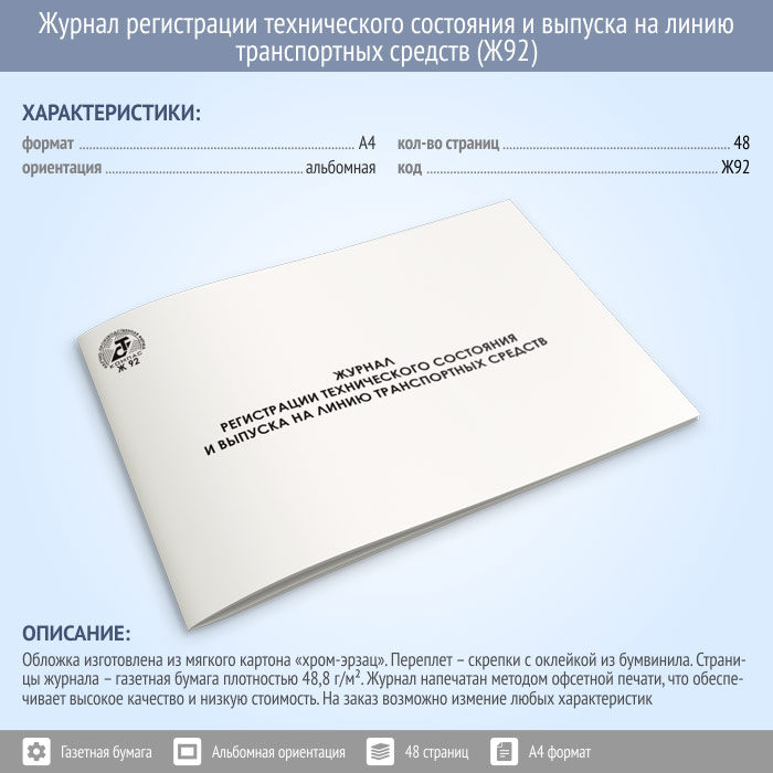 Журнал регистрации технического состояния и выпуска на линию транспортных средств (48 стр., Ж92) в Магнитогорске купить