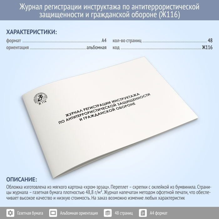 Журнал регистрации инструктажа по антитеррористической защищенности и гражданской обороне (48 стр., Ж116) в Магнитогорске купить