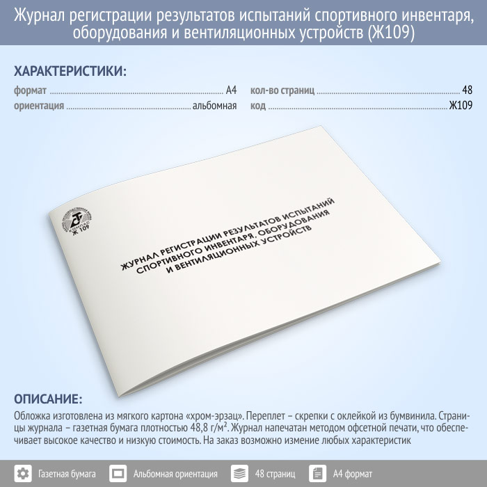 Журнал регистрации результатов испытаний спортивного инвентаря, оборудования и вентиляционных устройств (48 стр., Ж109) в Магнитогорске купить