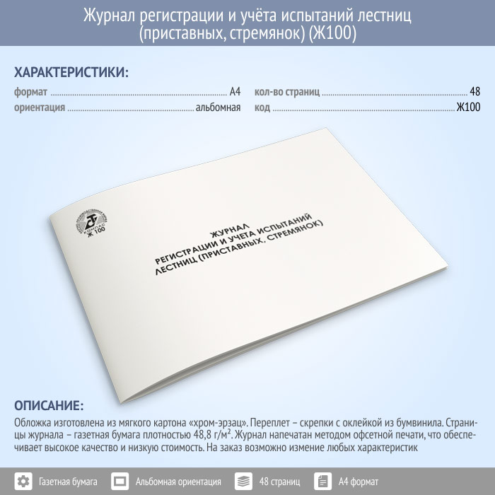 Журнал регистрации и учета испытаний лестниц (приставных, стремянок) (48 стр., Ж100) в Магнитогорске купить