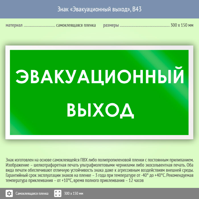 Знак «Эвакуационный выход» может быть изготовлен любого размера на самоклеящейся пленке, пластике толщиной 0.5, 2 или 4 мм и металле. Также возможно применение фотолюминесцентных и световозвращающих материалов