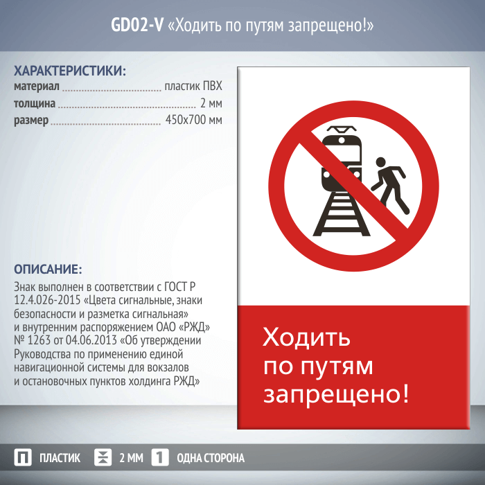 Знак безопасности «Ходить по путям запрещено!» выполняется в одностороннем (металл и пластик) и двустороннем (только металл) виде, на ПВХ-пластике, толщиной 2 мм или листе оцинкованного металла, толщиной 0,8 мм. Размеры знаков - 450 мм х 700 мм (вертикальная ориентация) либо 540 мм х 220 мм (горизонтальная ориентация). Знаки изготавливаются в полном соответствии с ГОСТ Р 12.4.026-2015 «Цвета сигнальные, знаки безопасности и разметка сигнальная» и внутренним распоряжением ОАО «РЖД» № 1263 от 04.06.2013 «Об утверждении Руководства по применению единой навигационной системы для вокзалов и остановочных пунктов холдинга РЖД». По желанию заказчика возможно использование светоотражающих материалов. Так же при необходимости производим закругление углов знака