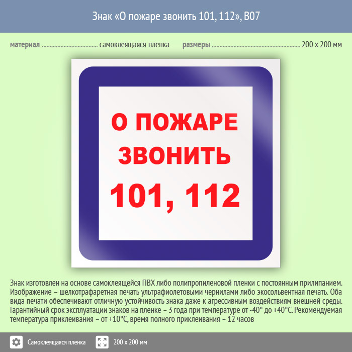 Табличка «О пожаре звонить 101, 112» предназначена напомнить о главных номерах пожарной службы. Код знака: B07