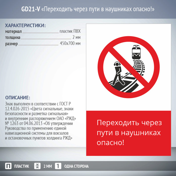 Знак безопасности «Переходить через пути в наушниках опасно!» выполняется в одностороннем (металл и пластик) и двустороннем (только металл) виде на ПВХ-пластике, толщиной 2 мм или на листе оцинкованного металла, толщиной 0,8 мм. Размеры знаков - 450 мм х 700 мм (вертикальная ориентация) либо 540 мм х 220 мм (горизонтальная ориентация). Знаки изготавливаются в полном соответствии с ГОСТ Р 12.4.026-2015 «Цвета сигнальные, знаки безопасности и разметка сигнальная» и внутренним распоряжением ОАО «РЖД» № 1263 от 04.06.2013 «Об утверждении Руководства по применению единой навигационной системы для вокзалов и остановочных пунктов холдинга РЖД». По желанию заказчика возможно использование светоотражающих материалов. Так же при необходимости производим закругление углов знака