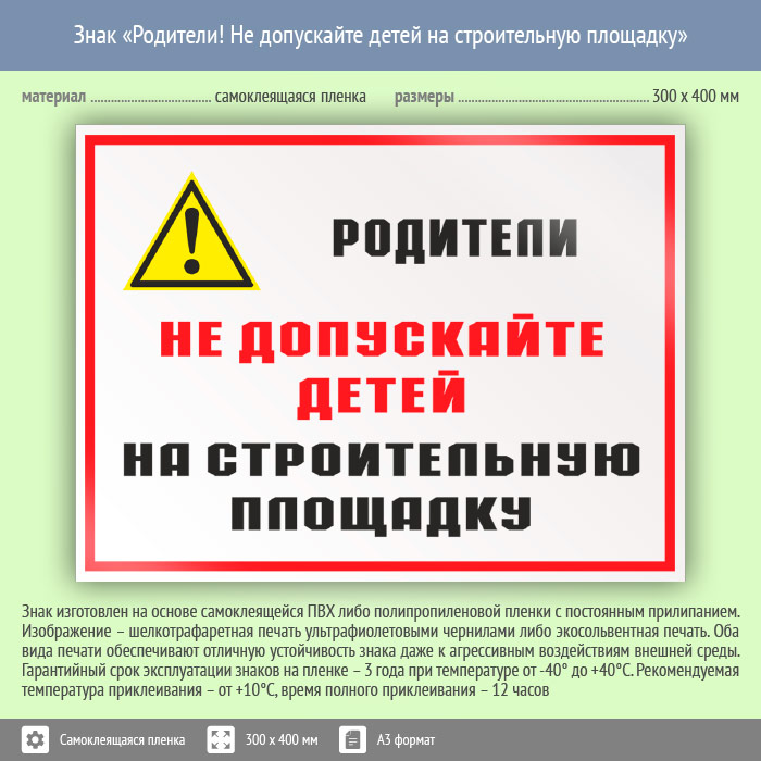 Знак «Родители! Не допускайте детей на строительную площадку» может быть изготовлен любого размера на самоклеящейся пленке, пластике толщиной 0.5, 2 или 4 мм и металле. Также возможно применение фотолюминесцентных и световозвращающих материалов
