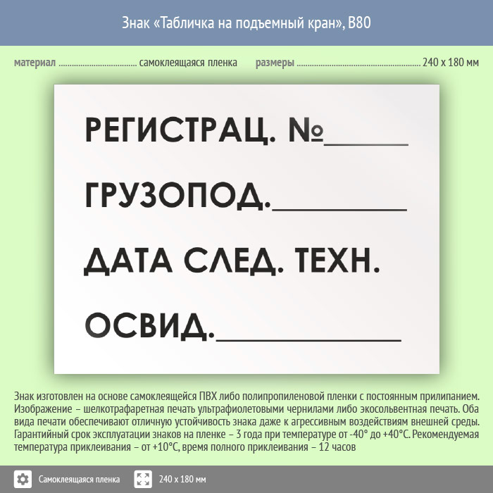 Знак «Табличка на подъемный кран» может быть изготовлен любого размера на самоклеящейся пленке, пластике толщиной 0.5, 2 или 4 мм и металле. Также возможно применение фотолюминесцентных и световозвращающих материалов