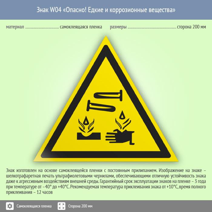 Знак W04 «Опасно! едкие и коррозионные вещества» (пленка, сторона 200 мм)