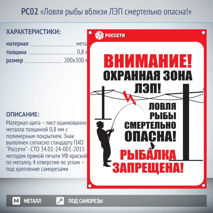 Знак «Ловля рыбы вблизи ЛЭП смертельно опасна!», РС02 (металл, 200х300 мм, отверстия под саморезы) в Магнитогорске купить