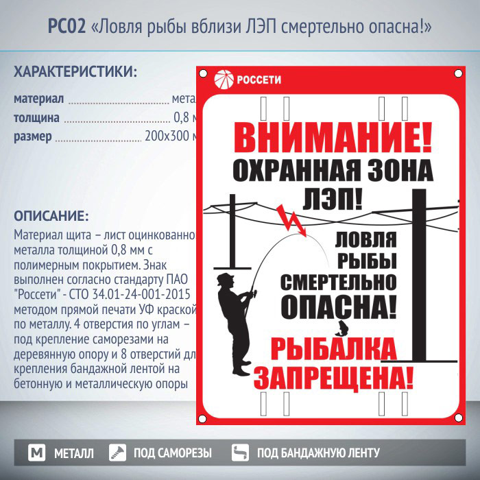 Знак «Ловля рыбы вблизи ЛЭП смертельно опасна!», РС02 (металл, 200х300 мм, отверстия под бандажную ленту) в Магнитогорске купить