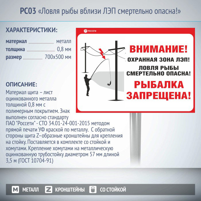 Информационный щит «Ловля рыбы вблизи ЛЭП смертельно опасна!», РС03 (металл, 700х500 мм, с металлической стойкой) в Магнитогорске купить