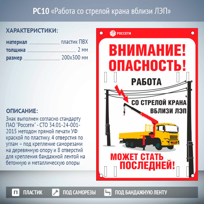 Знак «Работа со стрелой крана вблизи ЛЭП», РС10 (пластик 2 мм, 200х300 мм, отверстия под бандажную ленту) в Магнитогорске купить