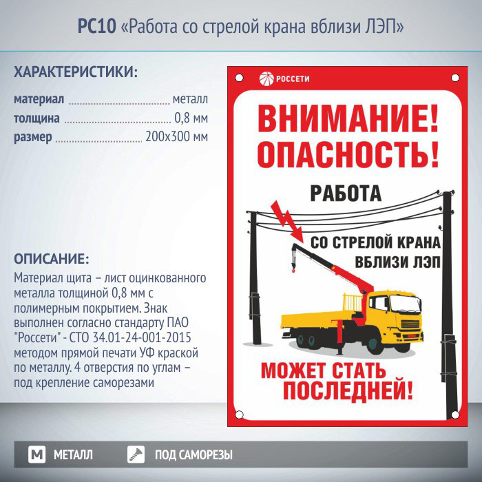 Знак «Работа со стрелой крана вблизи ЛЭП», РС10 (металл, 200х300 мм, отверстия под саморезы) в Магнитогорске купить