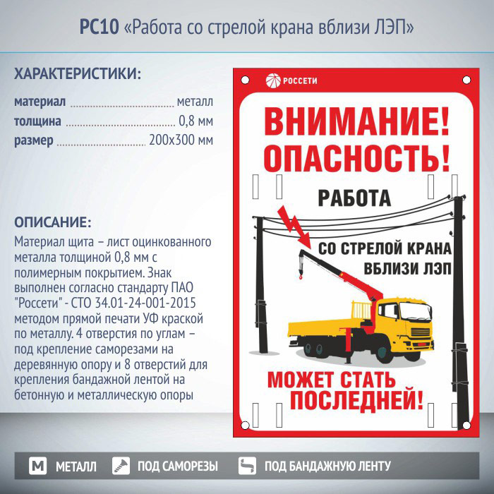 Знак «Работа со стрелой крана вблизи ЛЭП», РС10 (металл, 200х300 мм, отверстия под бандажную ленту) в Магнитогорске купить
