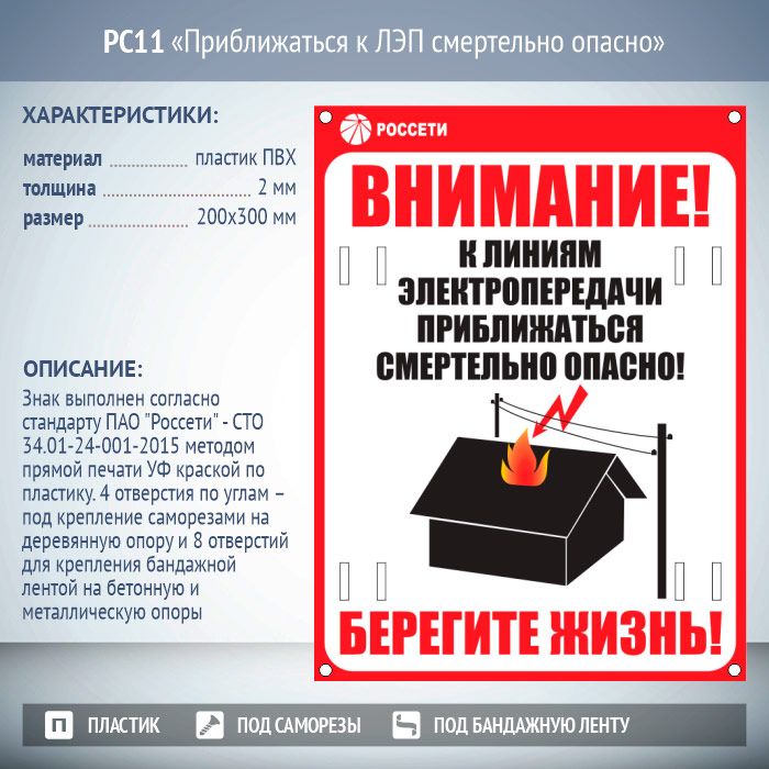 Знак «Приближаться к ЛЭП смертельно опасно», РС11 (пластик 2 мм, 200х300 мм, отверстия под бандажную ленту) в Магнитогорске купить