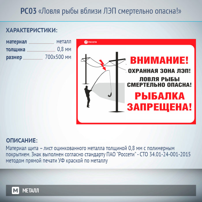 Информационный щит «Ловля рыбы вблизи ЛЭП смертельно опасна!», РС03 (металл, 700х500 мм) в Магнитогорске купить