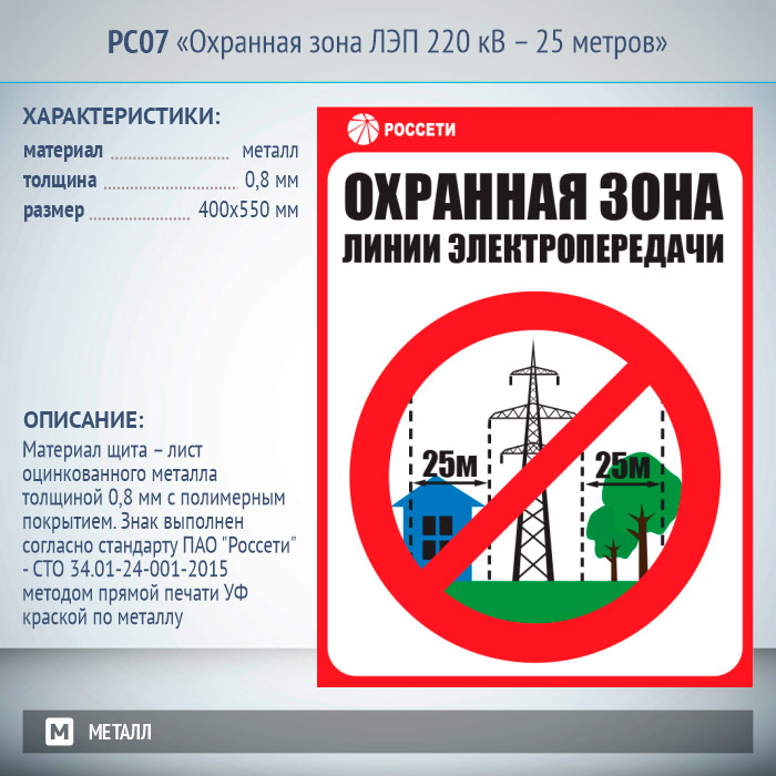 Знак «Охранная зона ЛЭП 220 кВ – 25 метров», РС07 (металл, 400х550 мм) в Магнитогорске купить