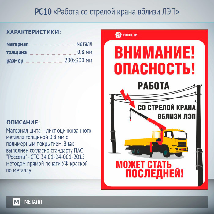 Знак «Работа со стрелой крана вблизи ЛЭП», РС10 (металл, 200х300 мм) в Магнитогорске купить