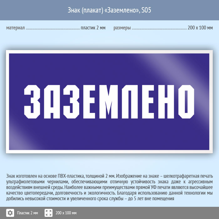 Знак (плакат) «Заземлено», S05 (пластик, 200х100 мм) в Магнитогорске купить