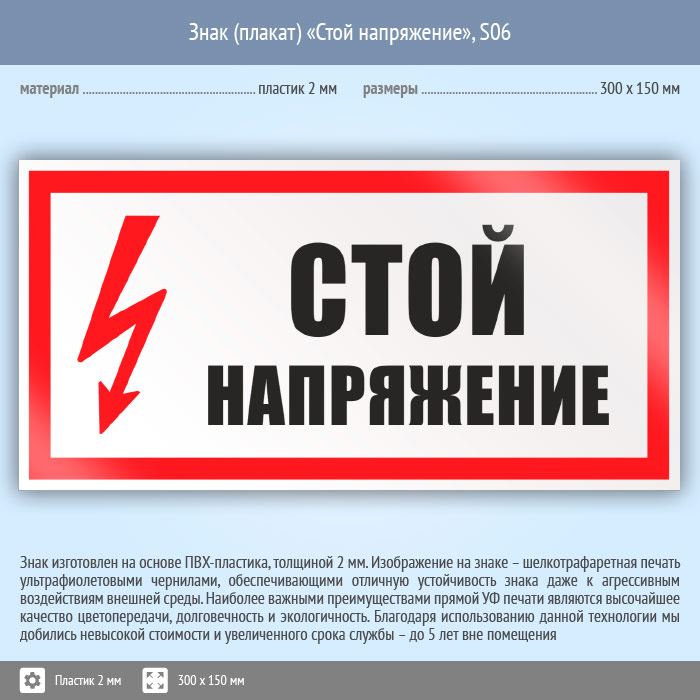 Знак (плакат) «Стой напряжение», S06 (пластик, 300х150 мм) в Магнитогорске купить