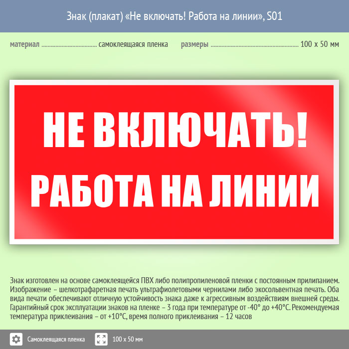 Знак (плакат) «Не включать! Работа на линии», S01 (пленка, 100х50 мм) в Магнитогорске купить
