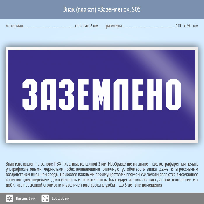 Знак (плакат) «Заземлено», S05 (пластик, 100х50 мм) в Магнитогорске купить