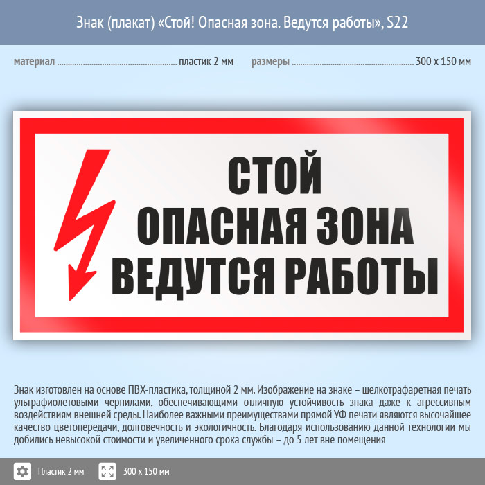 Знак (плакат) «Стой! Опасная зона. Ведутся работы», S22 (пластик, 300х150 мм) в Магнитогорске купить