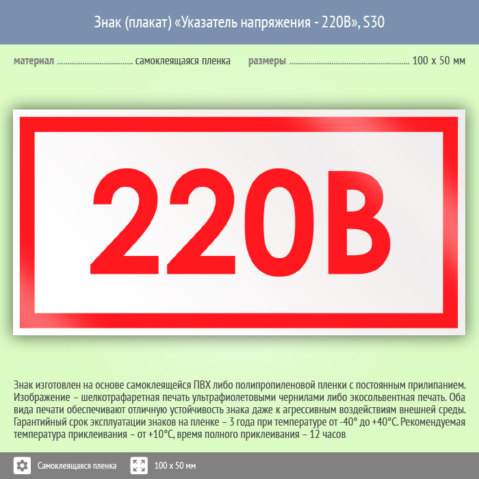 Знак (плакат) «Указатель напряжения - 220В», S30 (пленка, 100х50 мм) в Магнитогорске купить